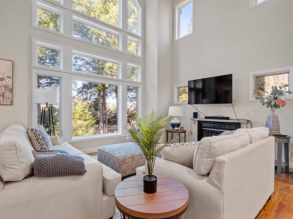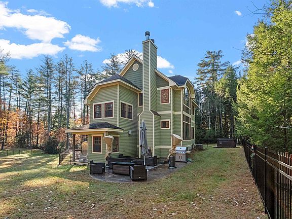 Discover the perfect blend of luxury, privacy, and resort living at 147 Pemi River Road. Nestled on nearly two serene acres in the prestigious Owl’s Nest Resort, this home offers Pemigewasset River access and optional resort-style amenities. Enjoy golf, tennis, pickleball, a fitness center, heated pools, and award-winning dining, with optional landscaping and snow removal services. The property’s charm and seclusion immediately stand out. A fully fenced yard ensures safety for pets and children, while the riverbank and grassy yard create a peaceful retreat. Inside, the home has been thoughtfully upgraded to blend comfort and modern style. The redesigned kitchen features high-end appliances, a coffee bar, and seating. The home offers four inviting bedrooms and three and a half updated bathrooms, including a new top-floor suite, offering flexibility for families or guests. Vaulted ceilings and large windows bathe the living area in natural light, while a wood-burning fireplace adds warmth. A sunroom, versatile loft, and spacious deck provide even more space to relax or entertain. Outside, a large stained concrete patio with a wood-burning fireplace and hot tub invites you to unwind while taking in serene river views. With its updates, privacy, and optional resort amenities, this home is ideal as a full-time residence or weekend retreat. Furniture available for purchase. HOA approved plans for detached 35x26 3-bay garage with living space above, giving you the option to expand.