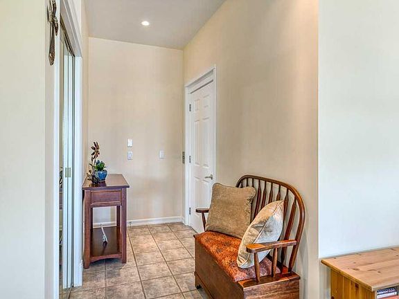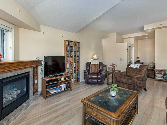 This is a rare opportunity to purchase a top-floor bungalow-style apartment with an oversized, heated double attached garage in the serene riverside community of Crawford Ranch. A secure, private 'New York' style elevator opens directly into your foyer, offering both convenience and privacy. The layout includes 10-foot ceilings, two bedrooms, and two full bathrooms. The living room features a cozy gas fireplace with built-ins, while the kitchen offers ample cabinetry, counter space, and access to a spacious deck. A separate dining area adds flexibility for everyday use or entertaining. The primary bedroom window backs onto a forested area, making it extremely private. The spacious ensuite includes a soaker tub, separate shower and large walk-in closet. The second bedroom and full bath are ideal for guests. In-suite laundry is located near the secondary exit, which leads directly to an outdoor greenspace. There is also the added bonus of a sink in the garage, with hot and cold water. Recent updates include a new hot water tank, new laminate flooring, new MET blinds (including some darkening blinds and motorized blinds) and a full building exterior building replacement. Steps from the river and walking paths, this home is well-suited for buyers seeking a practical, low-maintenance lifestyle in a quiet community.