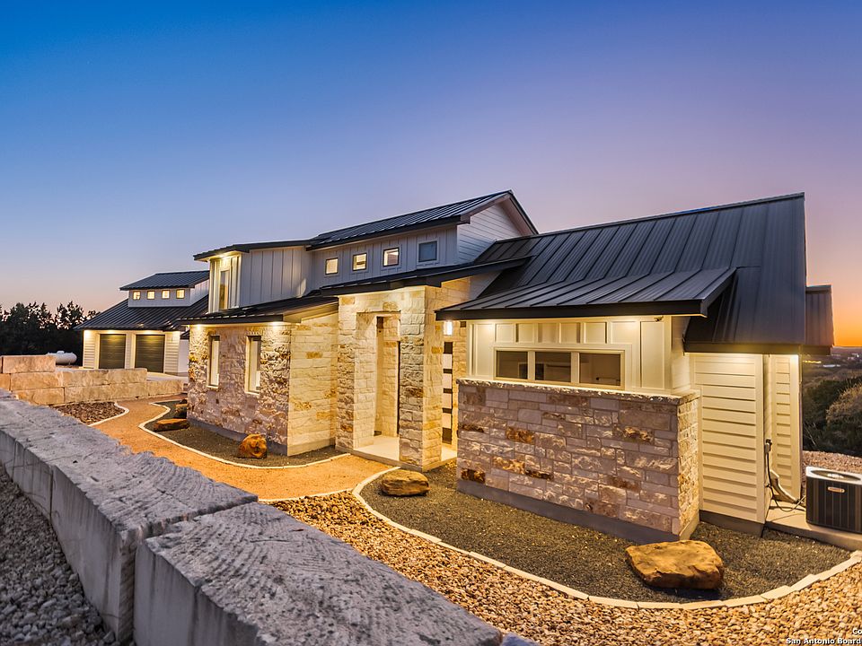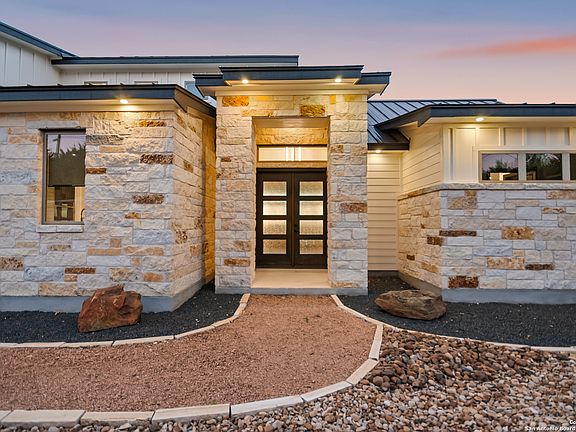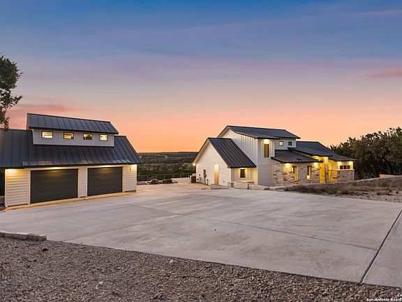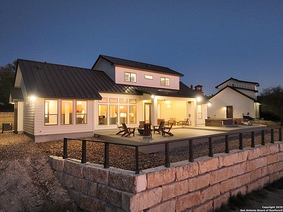 Welcome to your dream home in El Dorado Heights. This impressive 2,740 sf property features five bedrooms and four bathrooms, perfectly suited for family living or as a spacious lake getaway. The main house is 2,365 sf, and the loft above the garage is 375 SF and includes one bedroom and one bathroom. Step through the front double doors into an open floor plan where the living room, accentuated by floor-to-ceiling windows, bathes the area in natural light and provides a view for miles. Overhead, ceiling beams add architectural interest, while the linear fireplace brings a modern flair to the space. The living room seamlessly transitions into the dining room and kitchen. This kitchen features a distinctive island with seating, perfect for casual dining or entertaining guests. It's complemented by Taj Mahal countertops and a backsplash that extends to the ceiling. The spacious primary bedroom serves as a true sanctuary, offering another breathtaking view of the Texas Hill Country. It includes an en-suite bathroom, a walk-in shower, and dual sinks. Step outside to enjoy the breathtaking scenic views from the covered patio or sun deck, or unwind in the hot tub after a long day. Additional features include a two-car detached garage with a one-bedroom, one-bathroom loft above, perfect for guests or as a rental opportunity. It's close to New Braunfels, Wimberley, Gruene, and the Guadalupe River, this home offers both tranquility and convenience within the Comal ISD. Discover the perfect blend of comfort and luxury in this exquisite Canyon Lake residence. This home comes fully furnished.