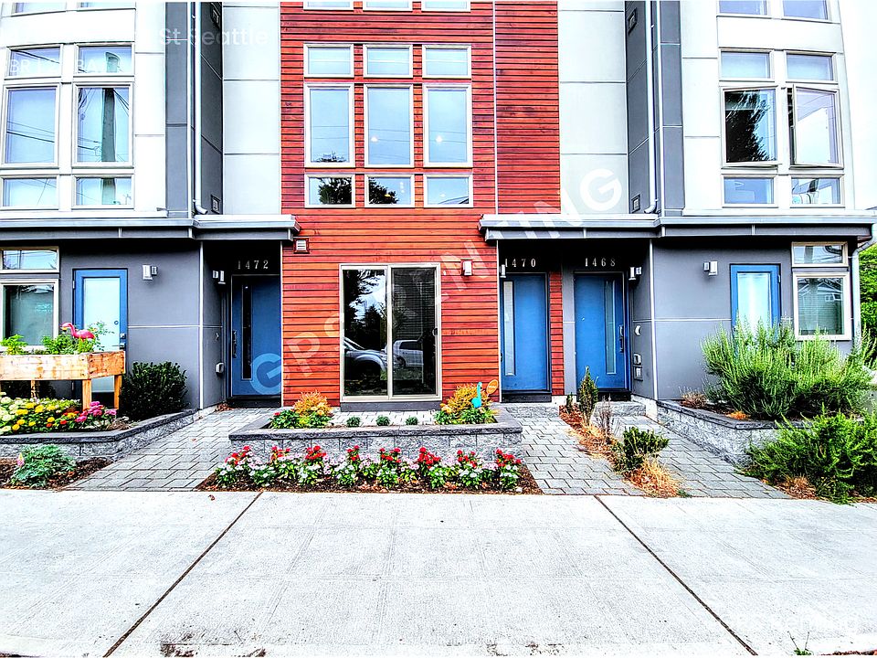 Stunning new modern townhome in a fantastic Ballard location! Abundant light from walls of windows, designer finishes, elegant open great room, and chef's kitchen with quartz eating island, custom tile, and stainless appliances. Floating staircase with custom steel rails. The top floor has a large master suite with a luxurious bath. Huge rooftop deck with incredible views. This property has radiant heat.