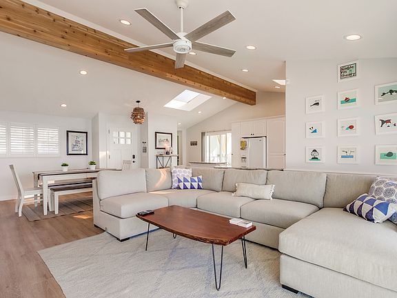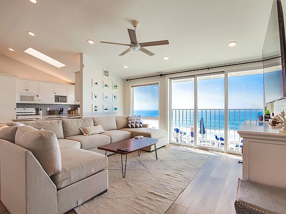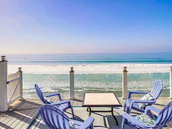 *This home requires a 1-month minimum booking. AVAILABLE SEPTEMBER 1ST! Relax & enjoy beautiful sunsets & endless ocean views in this private villa, situated on an amazing 1/3 acre of ocean front land with 75' of ocean frontage in the laid back beach town of Encinitas. This professionally designed offering features fun hidden treasures & high end luxury finishes throughout. Highlights include 5br + 4.5ba, 2 levels, an unprecedented ~10,000sf of outdoor space, 4+ parking, fire pit, a/c, dogs ok, sleeps 12, & a short 2 blocks to Grandview beach. SUMMARY Relax & enjoy beautiful sunsets & endless ocean views in this private villa, situated on an amazing 1/3 acre of ocean front land with 75' of ocean frontage in the laid back beach town of Encinitas This professionally designed offering features fun hidden treasures & high end luxury finishes throughout. Highlights include 5br + 4.5ba, 2 levels, an unprecedented ~10,000sf of outdoor space, 4+ parking, fire pit, a/c, dogs ok, sleeps 12, & a short 2 blocks to Grandview beach. GROUND LEVEL (main living area, 2br+2.5ba) Tastefully designed, this home won't disappoint even the most discerning guests. Step into the main front entry to a wonderful, bright, & spacious open floor plan with floor to ceiling windows looking out to 180 degree ocean views. The main living area includes an plush sofa sectional that seats 6-8, SMART Samsung mounted TV, high ceilings with wood beam, recessed lighting, & wood plank flooring. Adjacent is dining area for 6 & fully equipped kitchen both with views out to the ocean. Off the kitchen is a set of sliding patio doors leading to a built in BBQ & separate covered outdoor dining table with views out to the ocean. Off the main living area is our flagship ocean view master retreat with SMART Samsung mounted TV, his/her wardrobe closets, & floor to ceiling windows. The ensuite ba won't disappoint & is our personal favorite part of the home, housed with privacy sliding barn doors, dual vanities, separating soaking tub, & an oversized sunken shower with automated touch control commands, rain shower, steam shower, all surrounded by full slab of royal blue Brazilian quartz and views looking out to the ocean! The opposite side of the home is hidden br2. A guest favorite, this room features double Queen built in bunk beds with a nautical theme design/decor, SMART TV, & ensuite ba with crystal blue quartz counters & sliced pebble surround shower. Rounding out this level is a half ba & side by side LG washer/dryer located off the hallway. LOWER LEVEL (2nd living area, 2br+2ba+den/optional br) A set of hidden stairs will lead out to the lower level, conveniently equipped with a den/optional br that includes a Queen murphy bed, SMART TV, kitchenette with beautiful crystal blue quartz counters & stainless appliances, easy patio sliding door access out to the expansive ocean front yard, & adjacent full ba (surround shower). Down the hallway are 2 additional br's, each with a Queen bed & jack and jill ba (surround shower). OUTDOOR + OTHER FEATURES Outdoor space galore! Approx. 10,000sf of outdoor space including 75' of private ocean frontage, an expansive ocean front patio, separate grassy front entry yard, & separate outdoor areas flanking each side of the home. Interior hidden treasures, fun for adults & children can you find the hidden bunk br & stairway? Our personal favorite oversized sunken master shower with automated touch commands, rain + steam shower, surrounded with floor to ceiling royal blue Brazilian quarts, & views out to the ocean. WOW! Convenient living room & kitchen on Ground Level + an additional living area & kitchenette on lower level Custom built in Queen bunk beds, a fun place for children! Built in BBQ with adjacent outdoor dining table with views out to the ocean Multiple outdoor seating areas with shade umbrellas Cozy gas fire pit overlooking the ocean, the ideal evening gathering spot Central Heating & Air Conditioning System Side x Side LG brand washer & dryer Full floor windows & sliding patio doors that fully capture the incredible water & sunset views Upscale furnishings & living design, with a coastal theme in mind & gray/white/blue tones Combination of luxury wood plank flooring & plush carpet Dogs ok! SONOS music system Beach gear, including boogie boards, beach chairs, towels, & sand toys PARKING (4+) Have multiple oversized trucks & SUVs we have you covered. Parking includes an uncovered side x side driveway, and a separate driveway that extends the full length of the home. BED + BATH ARRANGEMENTS (sleeps 12) Master Retreat (ground level) | 1 Cal-King (sleeps 2) + TV + ensuite (spa tub & sunken steam shower) Br 2 (ground level) | 2 Queen bunk sets (sleeps 4) + TV + ensuite ba (surround shower) Br 3 (lower level) | 1 Queen (sleeps 2) + jack & jill ba (surround shower) Br 4 (lower level) | 1 Queen (sleeps 2) + jack & jill ba (surround shower) Br 5/Den (lower level) | 1 sofa sleeper (sleeps 2) + TV + adjacent ba (surround shower) Hallway (ground level) | half ba LOCATION Perfectly situated on a secluded stretch of beach located just a short 2 block walk to Grandview Surf & Swim beach in the laid back charming beach town of Encinitas! We are also just minutes to numerous eateries, shops, activities, and attractions. All our guests receive a comprehensive list of local recommended dining venues, here's a sneak peek: Dining | Walking distance to shops, restaurants, and entertainment along Coast Hwy 101. Some of our favorite eateries include The Taco Stand (nationally ranked), The Crack Shack & Handel's Ice Cream (3 minute walk) to name a few. Also just a few blocks to Lazy Acres natural grocery market. Activities | Just steps to Leucadia Surf School and Moonlight Beach! Rent beach gear, go for a swim, surf, or just lay in the white sandy beach & get some sunshine. Also nearby is the beautiful Botanic Garden, the ideal setting to connect with plants & nature. Attractions | Just 7 miles away is LEGOLAND Cal
