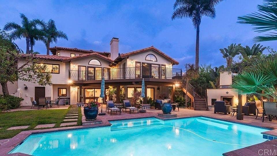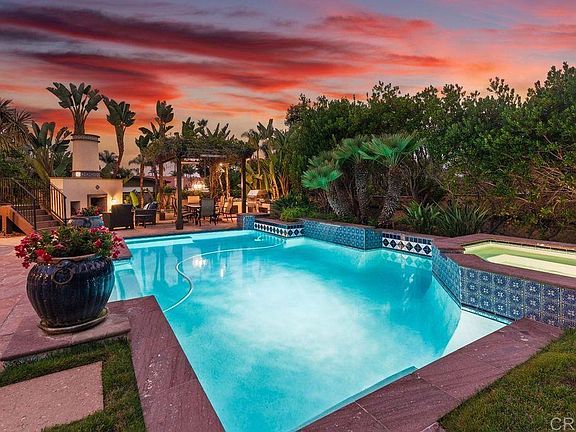 Elegant Mediterranean Villa with Riviera-Style Ambiance in Cardiff’s Coveted Composer District! This residence offers ocean views, lush gardens, pool/jacuzzi with waterfall features. Timeless Architectural Highlights: stone columns flank the double door entry that opens to soaring ceilings, oversized crown molding. Dramatic staircase with wrought iron railings & wood plank steps lead to the mezzanine with ocean views & the soaring entry area...other highlights include art niches and perfectly placed windows bringing in natural light. The rich wood plank floors and tumbled travertine stone offers warmth and elegance. Main floor living offers stone surround fireplaces, open beam ceiling, custom cabinetry and arched windows. The Formal Dining Room is next to the custom designed kitchen, with abundant granite countertop, glass front cabinetry w/ custom hardware and high end appliances. The heart of the home kitchen opens to the family room with open beam ceilings, built in entertainment wall (find the seahorse handles!) Sliding glass door leads to an entertainment deck perfect for indoor outdoor entertaining and a staircase to the pool and gardens. The main floor has a guest bedroom with a charming bay window seat near main level bathroom. Upstairs off the mezzanine is the spacious primary suite and deck with amazing ocean and coastline views. The suite includes a luxurious primary bath plus a large customized walk-in closet. Downstairs are two bedrooms with walk-in closets sharing a Hollywood Jack & Jill bath...Billiards/Game room w/fireplace, and a built-in office area, temperature controlled Wine Cellar plus a full bath & laundry room.... private resort backyard w/ fireplace, outdoor kitchen with BBQ, and a charming trellis covered dining area surrounded by mature palms and birds of paradise.