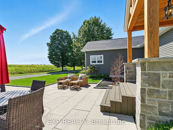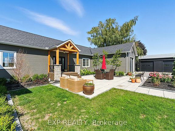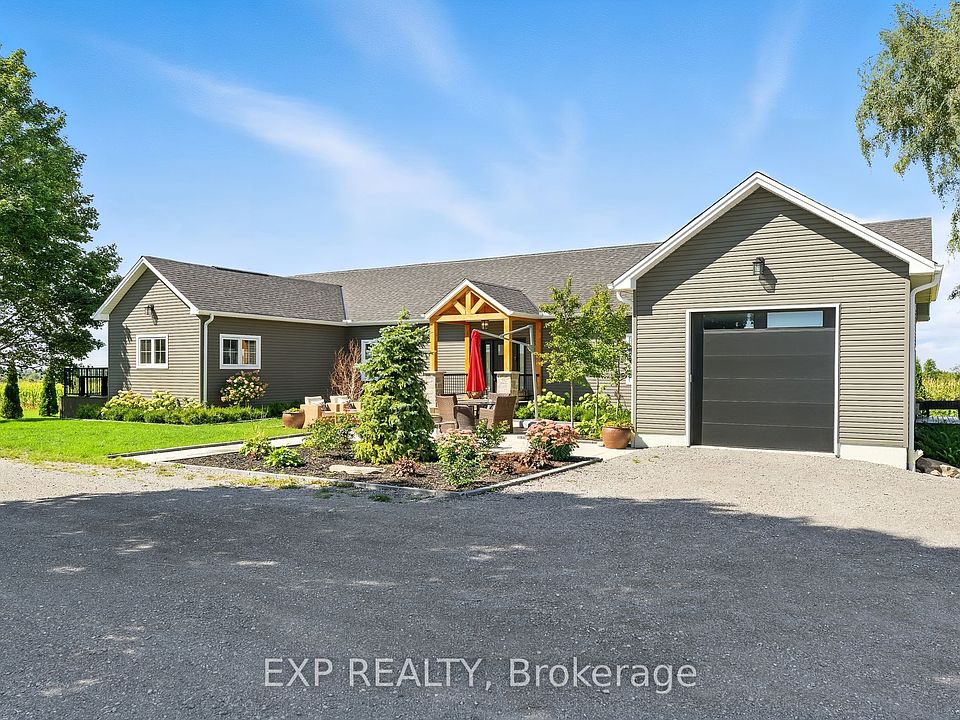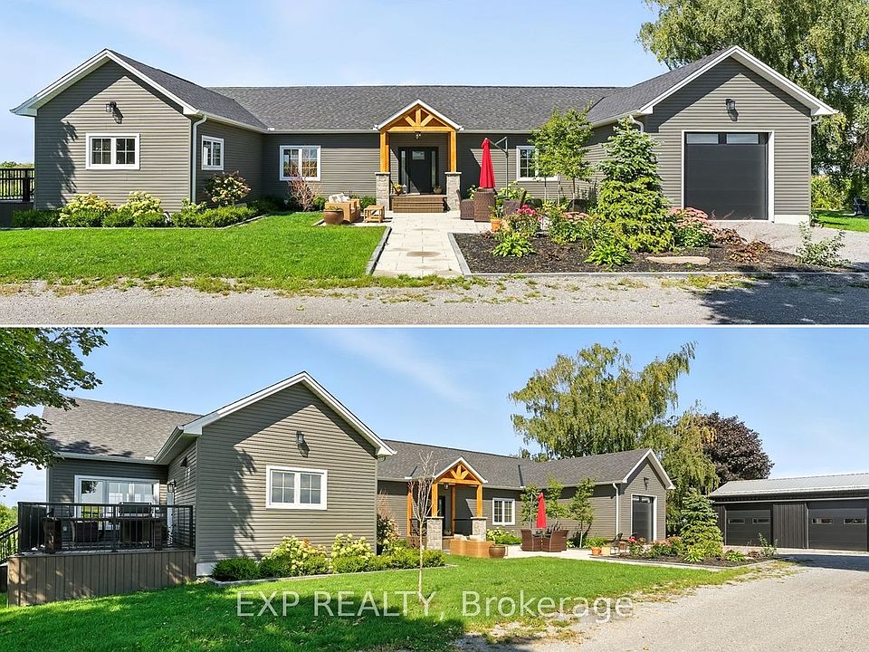 Welcome to this custom-built luxury bungalow on 1.54 acres of private countryside, offering modern comfort with timeless rural charm. A tree-lined driveway leads to beautifully landscaped grounds, a welcoming front porch, & multiple outdoor living spaces, including a raised deck & spacious patio for entertaining. The main level of this home is thoughtfully designed to combine everyday functionality with elegant style. A welcoming foyer with a double closet leads into the open-concept living spaces, where soaring ceilings with wood beams, expansive windows, & a striking fireplace create a bright & inviting atmosphere. The chefs kitchen is a true highlight, featuring high-end appliances, custom cabinetry, a large centre island, & a walkout to the deck. Seamlessly connected, the dining area & living room provide an ideal setting for gatherings, with natural light flooding the space from every angle. The primary retreat offers built-in cabinetry, a luxurious 5-piece ensuite with soaker tub & glass shower, & private access to the deck. A second bedroom, currently staged as a home office, adds convenience for guests. Completing the main floor is a well-equipped laundry & mudroom with direct access to the attached garage. The fully finished lower level extends the living space beautifully. A wide staircase with glass railing opens to the rec room, complete with a sleek wet bar, custom built-in shelving, & a cozy fireplace. A glass-enclosed gym provides a dedicated space for fitness while maintaining an open, modern feel. Two generously sized bedrooms, each with large above-grade windows, are complemented by a stylish 4-piece bathroom. The lower level offers the ideal blend of relaxation, recreation, & practicality, while also housing a utility room for added convenience. With an attached garage plus a detached workshop, this property is ideal for both relaxation & practicality, all while surrounded by sweeping farmland views & just minutes from nearby amenities.