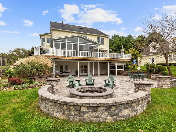 View "floor plan tour"at wfp.com for all interior photos. Crave privacy and serenity? Georgian colonial situated on a rare private 6+ acre lot, views of rolling green ringed by trees. Enter through double mahogany doors to a sweeping hallway that takes your eye through the double french doors to the inviting screened porch and out to the green landscape as far as the eye can see. The traditional floor plan includes formal living and dining rooms, library with bay window and breakfast room with bay window which wrap around to the gourmet kitchen with high end appliances including Sub Z refrigerator, gas stove with downdraft, custom cherry cabinetry, granite countertops and a super pantry. Kitchen is open to the cozy family room with picture window overlooking the gracious backyard. 5 bedrooms on the next 2 levels and 3 full baths, including a laundry room on the bedroom level. The Master Bedroom has a private office/dressing suite and a newly updated spa-like Master Bath. 3rd level up has 2 generous bedrooms with a full bath to share, ideal for guests or returning college students to get away while being at home! The lower level walkout is light filled and space for everything including a full bath, an office/bedroom, gym, media center and more! Outdoor entertaining is a dream from the lower level to the huge paver patio with fire pit to the wrap around deck with outdoor shower and hot tub. The detached 4+ car garage looks like a charming cottage and has loads of potential for additional finished space or just storing all the cars for your family under roof!