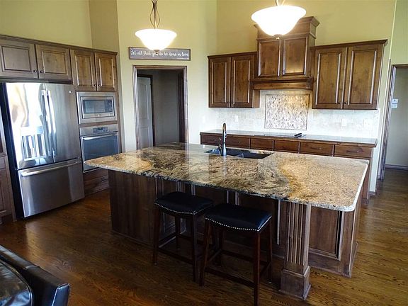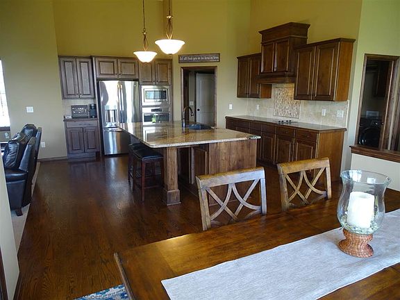 Spacious like new home in The Meadows in Auburn Hills in Goddard schools. You'll find your family will gather around the huge granite island with sink in the open kitchen for everything, not just meals. Hardwood flooring in the kitchen and dining area is open to the awesome living room with stone gas FP and features a 15' vaulted ceiling. The split bedroom plan has the large MBR & MBA with dual sinks, soaker tub and separate shower on one end, and two BR's with hall bath between them on the other end. Nice separate laundry room, huge pantry and built in hall tree/bench round out the main floor. The view out basement has 670 sf of open space with built ins for a large TV. It has a great wet bar area, 2 more BR's, BA, and a bonus room which could be office, game room, or great play area for the little one. It has a nice covered deck protected from the evening sun for cool evening relaxation. The mid-level walk out door leads to a nice patio and the yard is fully sprinkled. An excellent home to raise a family in! Deck will be stained prior to closing. All information deemed reliable but not guaranteed