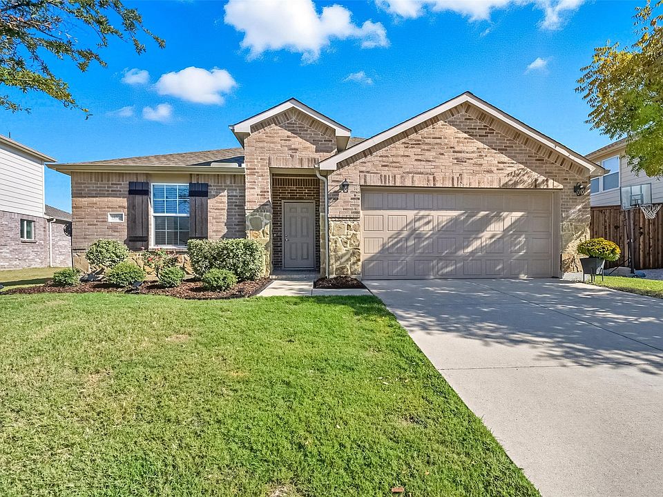 Welcome to this beautifully maintained single-story home in the highly sought-after Frisco ISD. Offering 3 bedrooms plus a versatile flex room—perfect for a 4th bedroom, home office, gym, or second living area—this home provides flexibility to fit your lifestyle. The open floor plan features fresh paint, luxury vinyl plank flooring, and updated carpet, creating a modern and inviting feel throughout. The kitchen is equipped with granite countertops, an island with bar seating, stainless steel appliances, recessed lighting, and a pantry. A spacious dining area flows seamlessly into the living room, highlighted by a cozy wood-burning fireplace—ideal for both everyday living and entertaining. The generous primary suite offers a relaxing retreat with a large bedroom, walk-in closet, and en-suite bathroom featuring dual sinks, a walk-in shower, and a separate garden tub. Additional features include roof installed in 2025, gutters, a sprinkler system, a large laundry room, and a covered backyard patio for outdoor enjoyment. This move-in ready home combines comfort, style, and convenience—all within a top-rated school district.