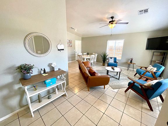 As you step into this meticulously crafted abode, you'll be greeted by the warm embrace of tile flooring that extends throughout the home, offering both durability and sophistication. The living room beckons with its inviting ambiance, adorned with desert themed wall decor, comfortable lounging chairs, couch and a flat screen TV, perfect for cozy evenings with your favorite shows or loved ones.