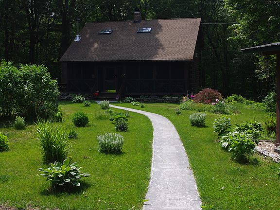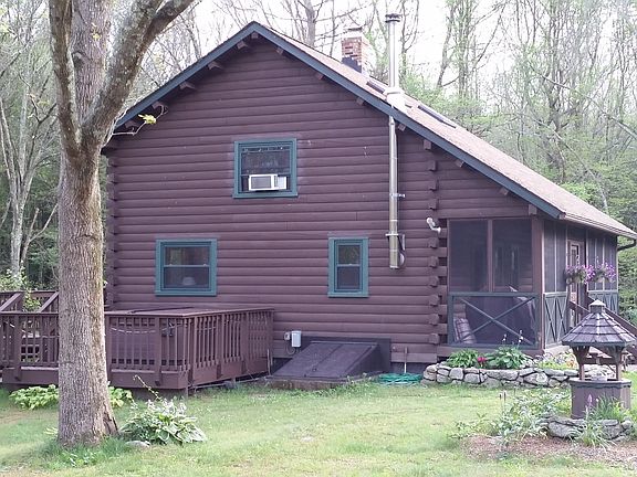 Beautiful open concept log home on 4.3 acres with kitchen, dining, living and full bath on first floor. Master with half bath, office and second bedroom on second floor. Full length screen porch. Back deck (20' x 12') with Sunsetter awning. Side deck (12' x 12') with Bull Frog spa. Oil fired hot air/hot water, plus Jotul wood stove in living room. New windows throughout. Giant 36' x 30' 3 car garage with storage above. Gardener's paradise with vegetable, fruit and flower gardens galore. Tractor/generator available . Pre-qualified buyers only. By appointment only.
