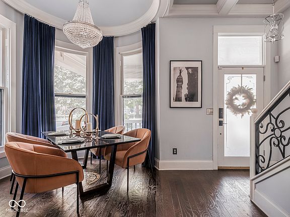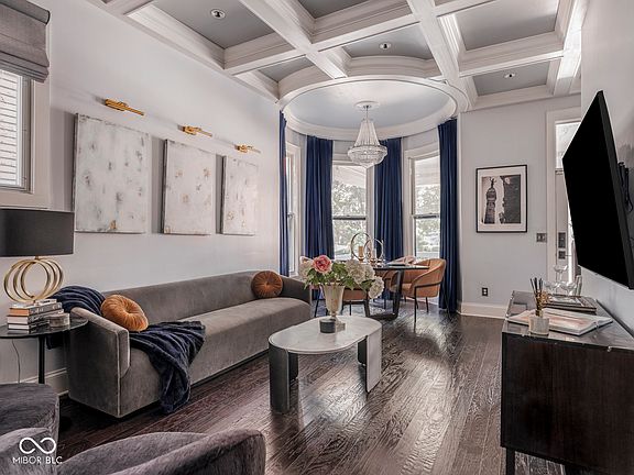 In the heart of the historic Old Northside awaits this showstopping townhome, meticulously restored and thoughtfully upgraded to the highest standard. Brimming with curb appeal, the home greets you with a large covered front porch-complete with porch swing-and its signature Victorian turret. Inside, timeless craftsmanship meets modern elegance: coffered ceilings, inlaid doors, warm hardwoods, and designer lighting set the tone. The open-concept main level is designed for entertaining, with a dreamy chef's kitchen featuring high-end appliances, slow-close custom cabinetry, marble counters, wall mounted pot filler, and a generous center island for effortless gathering. A rare main-level laundry/mudroom and an even rarer ATTACHED private garage complete this floor. Upstairs, two inviting bedrooms share a beautifully appointed bath with double vanity and a dual-head walk-in shower. The primary suite offers a charming turret reading nook and a private staircase leading to the third floor. This versatile bonus level includes a minibar, a full bath, a custom-designed walk-in closet, two built-in workspaces, and rounded windows with city views-perfect as a guest retreat, home office, fitness studio, or all three. Steps from acclaimed restaurants, shops, parks, and nightlife, this one-of-a-kind residence has even been featured in the IndyStar and Urban Times. Don't miss the chance to own a magazine-worthy home that blends historic character with modern function in one of Indy's most treasured neighborhoods. Minimal exterior maintenance and no HOA fees!