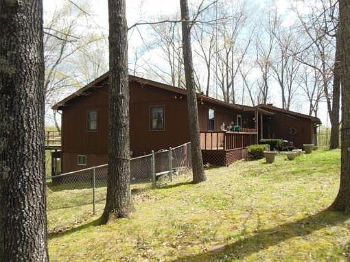 15 wooded acres with frontage on the South Prong of the Jacks Fork River. Comfortable 3 bedroom home. Open living room, dining area and kitchen. 18x20 downstairs family room. Screened in back porch off the lower floor. Deck. Chainlink fenced front yard. 12x20 car port. Two 8x10 storage buildings. Walking trail in the woods crosses a small footbridge and goes past the wildlife pond and gazebo. Located just off blacktop, offering a private setting and some great views!