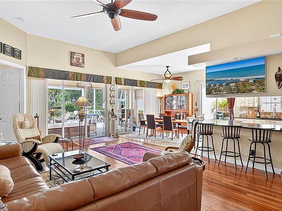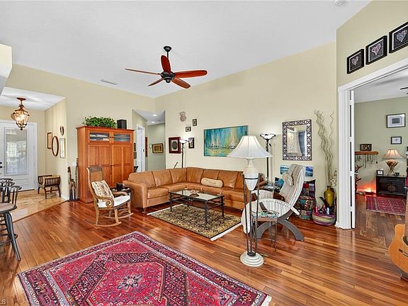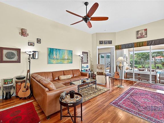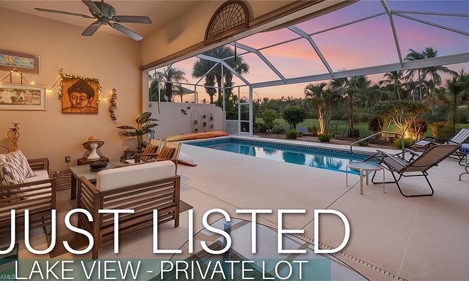 DREAMY DONATELLO!! With its whimsical touches, sophisticated upgrades, charming accents and fantasy pool backdropped by lush foliage and a sparkling lake, 14710 Donatello looks as if it were pulled from a dream!! Set on a peaceful location at the end of a quiet cul-de-sac, this popular "Oakmont" floor plan features wood, travertine, and tile floors throughout, (cozy carpet in one bedroom); upgraded kitchen with professionally painted "artist" cabinetry, 5-person raised breakfast bar with granite counters, newer stainless steel arched faucet, newer microwave, stovetop and oven, (dishwasher is stainless steel veneer); wide open floor plan, sunny southwest exposure with picturesque sunsets; large owner’s suite with shelved walk-in closet, soaking tub, 2 sinks, his and hers commodes, and dual entry walk-in-shower. Top it all off with 2 large guest bedrooms, spacious guest bath, large laundry room with glass block window, generous storage cabinets, utility sink, dryer and new washer; tall ceilings throughout and lots of wonderful natural light! As for the outdoors, enjoy a gorgeous, private space highlighted by BRAND NEW PICTURE WINDOW SCREENING ON THE POOL CAGE, modern pool with beautiful tile work and recent re-grouting, tropical landscape and glistening lake views, a large covered lanai for entertaining and a privacy wall shielding your activities! As for the age of the Key Components; 2023 Pool Pump, 2020 main Air Conditioner, 2020 Splitter Air conditioner for the garage, 2018 Hot Water Heater, $25,000 of repairs/replacements on original roof in 2022, including new underlayment in wall flashing areas, new roof tiles and new roof decking where needed as well as new gutters!! As a bonus, a stepping stone garden/side yard, a totally air conditioned, side-facing garage currently used as an arts & crafts studio, a large driveway and more!! This beautiful home is located in the friendly San Remo community in Bonita Springs with low HOA fees and no annoying CDD! Amenities include; a resort-style pool, tennis and pickleball courts, fitness room, clubhouse and playground. Located just a short drive to the area's best shopping, dining and entertainment, easy access to a new shortcut road to Naples (Logan), a straight shot to the beaches and close access to a wide open, paved walking/biking path connecting all the way from Bonita to North Naples!! Call for your private showing!!