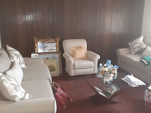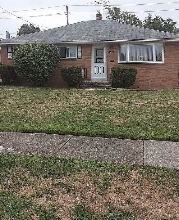 Brick Ranch has hardwood floors. Master has half bath. Spacious Kitchen.Large basement with kitchen. Basement is a great space for entertaining. 2 car garage. Property is sold AS-IS condition.