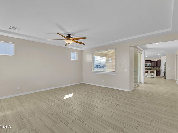 Enjoy life steps from scenic linear parks w/ walking & biking paths that connect you to neighborhood greens, playgrounds & peaceful desert views. This beautiful home offers an open layout filled w/ natural light, featuring a spacious kitchen w/ granite counters, stainless steel appliances, a large island & generous cabinet space. The inviting living & dining areas flow to a private side patio ideal for relaxing or entertaining. A separate flex room adds versatility, perfect for a 4th BR, home office, gym or playroom. The primary suite showcases tall ceilings, a walk-in closet & spa-inspired bath. Front tiled patio adds charm & curb appeal, while the rear-entry 3-car garage provides easy alley access, extra storage & a clean, polished front exterior. Located near all 3 schools for easy commutes & minutes from Ft Bliss, major roads & shopping. A perfect blend of style, comfort & convenience, all wrapped into a low-maintenance lifestyle you'll love coming home to!