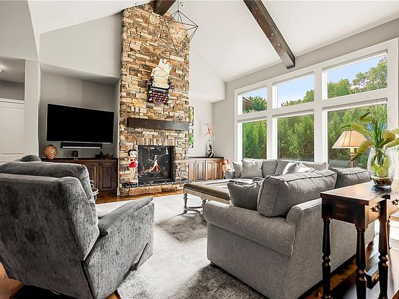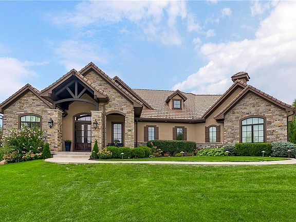 This fabulous custom home built by Starr Homes sits nestled on a wonderfully landscaped and private cul-de-sac lot in Leawood's highly sought Highlands Creek Subdivision. The open concept spacious main floor features vaulted ceilings, a cozy fireplace and gorgeous views of your private treed backyard. The kitchen features a stunning under-lit granite island, Thermador appliances and a large breakfast/dining area that opens to a fabulous lanai with built-in grill, fireplace and gas heater offering a wonderful extension of the indoors great for entertaining or just enjoying your private backyard. You'll find a fabulous primary suite on the main floor with a spa-like primary bath with large walk through double shower, adjacent laundry room and large walk-in closet. One additional bedroom on the main currently used as an office walks out to the lanai along with a large pantry, mud room and 1 1/2 additional baths can also be found on the main. The stunning lower level with 11' ceilings walks out to a spacious patio and features a full bar, wine cellar, rec/media room and 23x17 HD golf simulator. Three large bedrooms with private baths and plenty of storage space complete the lower level. This home has so much to offer with a 4-car side-entry garage with epoxy floors that is wired for an EV charger. At 5,848 finished sq ft and an overall sq ft of 7,869 and complete with an elevator and zero entry from the garage, this home truly offers something for everyone!