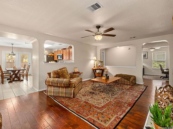 Pride of ownership can be seen when you walk inside this beautiful 3 bedroom single story home. Cute curb appeal and absolute PRIME location! Charm and comfort are felt when walking inside. Beautiful hard wood flooring in the living room and hallway, Custom shutters on the entry windows as soon as you step inside. Wood burning fireplace accents the living room wall. Eat in Kitchen with french doors to outside, updated appliances, light fixtures and natural light that overlook the living room. A flex room off the living room is perfect for a study or play room. Split floorplan offers great privacy for the primary that is tucked away at the back of the home with plenty of room for oversized furniture, a large walk in closet and primary bathroom. Down the hall you will find 2 addtional nice size bedrooms and a full bathroom. Laundry room inside with shelving for storage. Energy efficient home with paid off solar panels and very low electric bills and ceiling fans through out the home. Location is awesome with HEB around the corner,dining, shopping and minutes from McAllister Park and Airport! This home is a gem so hurry and schedule before it's gone.