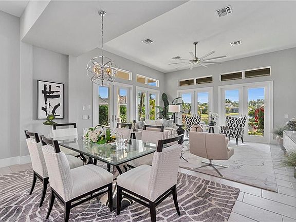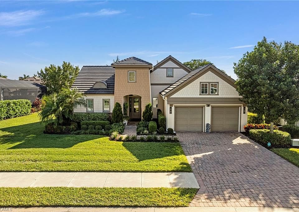 Welcome to 14714 Leeward Drive, a beautifully upgraded 3-bedroom, 3 1/2-bath lakefront residence offering 2,542 square feet of elegant living space with true southern exposure. This meticulously maintained home built by Ashton Woods features unobstructed lake views from the living room and primary suite, professionally landscaped grounds, and a rare wrap-around paver patio that extends along the side and rear of the home, creating exceptional outdoor living and entertaining space. The exterior enhancements include two remote-controlled lighted water fountains, programmable Lutron lighting around the home, a Blink security system with cameras at the front door, driveway, and rear, a summer kitchen and an outdoor ceiling fan. Inside, the home showcases natural stone flooring in the main areas and plush carpeting in the bedrooms. Each of the three bedrooms offers the privacy of its own bathroom. Storm-rated 7.5-foot French doors in the living room frame expansive lake views and lead to the outdoor patio. The kitchen features custom Italian cabinetry by Veneta Cucine with soft-close hardware, a large five-by-ten-foot island with extensive storage, a Whirlpool Gold Series built-in oven and microwave, and a 36-inch KitchenAid induction cooktop. Additional interior highlights include abundant storage throughout, a spacious laundry room with upper cabinets and under-counter storage, upgraded Minka Aire Raptor ceiling fans, wooden plantation shutters with 2.5-inch louvers, light dimmers throughout, flush-mounted dimmable LED lighting, a newer water heater, sliding glass shower doors in the front guest suite, and large flat-screen televisions with Sonos soundbars in both the living room and primary bedroom. Located in one of Naples’ most desirable communities, residents enjoy resort-style amenities including a clubhouse, fitness center, resort and lap pools, tennis, pickleball, walking trails, lakes, and gated security. With its premium southern exposure, extensive outdoor enhancements, high-end interior finishes, and peaceful lakefront setting, this home offers the ideal blend of comfort, design, and luxury living close to Naples beaches, shopping, dining, and Marco Island.