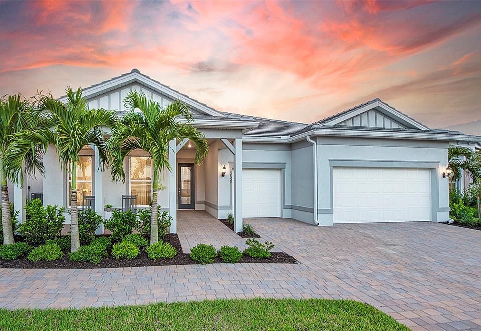 Under Construction. This Renown floorplan features 3 bedrooms, 3 full bathrooms, and 2 half baths, offering exceptional space and comfort. The home includes a 4' garage extension, built-in kitchen appliances, and a luxurious walk-in shower in the owner’s suite. Designed for indoor–outdoor living, it showcases zero-corner sliding glass doors that open to a custom pool and spa with a dedicated pool bath, along with an outdoor-kitchen pre-plumb. Additional upgrades include laundry room cabinets with countertops and a sink, as well as a tray ceiling in the gathering room—combining elegance, functionality, and resort-style living. Nestled in the esteemed Palmer Ranch area, Talon Preserve is a gated community offering a resort lifestyle with open floor plans, gourmet kitchens, and large outdoor living spaces. For those looking for resort lifestyle communities with private amenities and modern houses, or luxury homes for sale in Nokomis, FL, Talon Preserve should be your top choice. Neighborhood features include 18,000 sq. ft. Grand clubhouse with large community room for events, catering kitchen, social lounge, outdoor lounge, card-craft room and classic arcade room, State-of-the-art fitness center, performance training room and group fitness studio, 8 Pickleball courts, 2 Tennis courts, 4 Bocce courts, playground, firepit lounge, dog park, resort style pool, heated spa, splash pad, full-service restaurant bar & grill, & more!