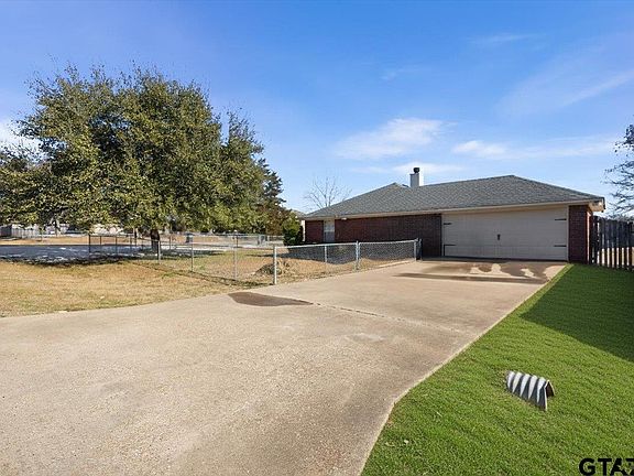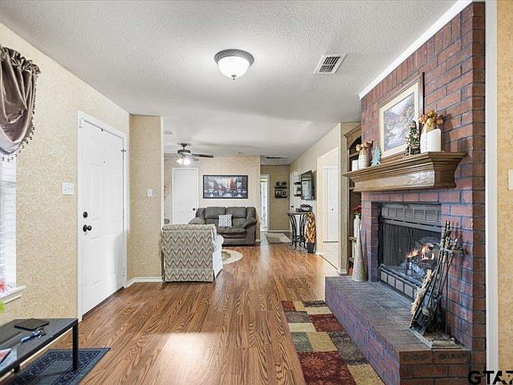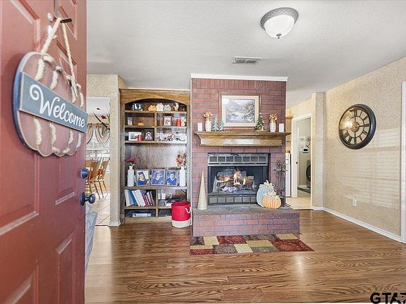 Step inside this property and immediately feel like you are home. Upon entering there is a wonderful wood fireplace and built in shelving ready for your family photos and favorite books. Enjoy home cooked meals in the perfect size dining area that has easy access to the fully functional kitchen featuring warm cabinetry, an electric oven and dishwasher. With three bedrooms each equipped with a ceiling fan, natural light and a closet, you have everything you need to enjoy a quiet space and relax. The primary bathroom has had several updates and a beautiful glass walk in shower. The backyard is incredibly inviting and spacious as well. Enjoy the spacious open concrete patio with plenty of room for grilling, a game of corn hole or sitting on rocking chairs enjoying the privacy the fenced in backyard offers. This home is in an excellent location with only an approx. 15 minute drive to Tyler shopping & dining and also has convenient access to Loop 49. 14716 Fox Ridge is the perfect combination of cozy living with opportunity for upgrades and customization to make it your own. Schedule your showing today!