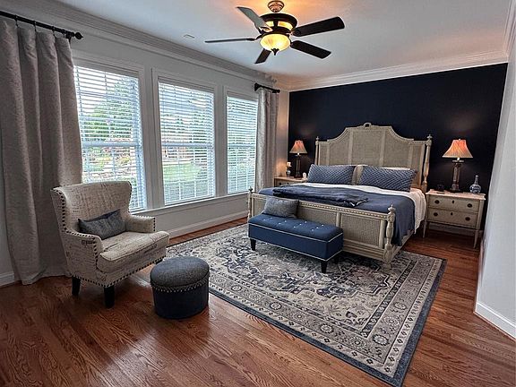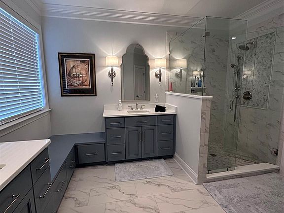 The main-level primary suite offers a serene retreat with newly installed hardwood floors and a fully renovated spa-inspired bath, showcasing upgraded tile, modern vanities, and a luxurious tile walk-in shower.