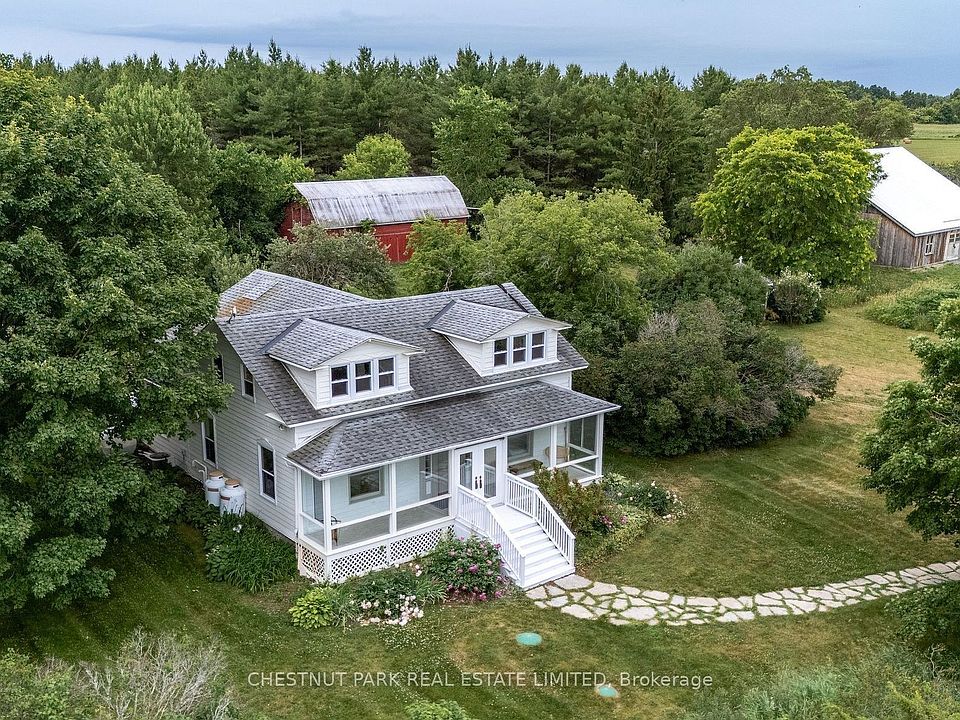 Featured in House & Home, this celebrated design retreat redefines elevated country living in Prince Edward County. Set on 15+ acres across two separately deeded lots, the property centres around an iconic 1850s farmhouse that has been transformed into a playful yet sophisticated escape featuring soaring cathedral ceilings, original barn beams, curated vintage furnishings, and richly layered textures throughout. With 4 bedrooms and 2 baths, the main residence operates as a fully licensed short-term rental with a strong income history and loyal following, offered turnkey and fully furnished. The adjacent parcel includes two striking barns; one preserved in its original character, the other reimagined by ERA Architects, known for their work on the Drake Devonshire and Brighthouse. Substantial progress has been made toward rezoning the site for event use, with the potential to host up to 100 guests. With elevated views across the countryside and water vistas toward the Bay of Quinte, this lot also presents an exceptional opportunity to add a second residence or create a private multi-home compound that blends nature, design, and lifestyle. With deeded waterfront access and a location minutes from some of PECs most notable wineries and restaurants, the Wilda Farmhouse isn't just a home, its a destination, a brand, and a canvas for your next chapter.