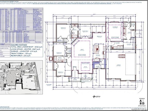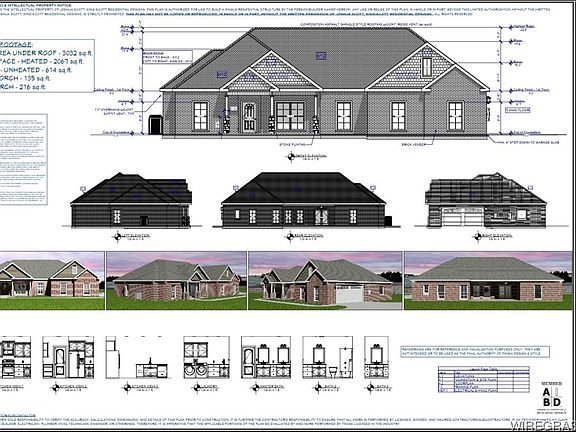 4 Bedrooms / 3 Bathrooms, 2,067 SqFt heated living area, Total under roof: 3,032 SqFt, Open concept living, kitchen, and dining areas, Walk-in pantry and large kitchen island, Master suite with tiled shower and walk-in closet, Gas fireplace, Covered front (135 SqFt) and rear (216 SqFt) porches, Two-car garage (614 SqFt), 2-acre lot.