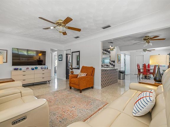 Welcome to your very own slice of the South Pasadena lifestyle! This renovated 2-bed, 2-bath Mid-Century Modern is the absolute definition of the effortless Florida living. Step inside the open-concept living and dining area, which is immediately bathed in glorious light, thanks to striking plantation shutters framing the surrounding windows. Gorgeous terrazzo floors flow throughout the block home, highlighting the classic charm while offering incredible durability. The chef's kitchen, set conveniently off the main living space, is a dream with endless countertop space, all new appliances, and a full suite of soft-close cabinetry. The adjacent sunroom has been fitted with central A/C to add valuable, usable square footage to the home! While this room is currently undergoing renovation, feel at ease knowing that the seller has been making great efforts to work with the city to have this completed before you move in. With a split floor plan offering privacy, both sun-filled bedrooms feature generous reach-in closets for easy storage. The primary bathroom has been completely remodeled and features a sleek, modern frameless shower-your daily retreat! The second bathroom retains its delightful, classic 1950s charm. The brand-new washer and dryer are conveniently located in the attached garage. Outside, the backyard spans into a breathtaking and tranquil space, perfectly landscaped for sun and shade. It features a covered patio with a new shell yard, making your weekend yard work a breeze. In addition, new French drains have been added to the backyard as well, and the wide side yard offers coveted space to park a small boat. Situated on a large corner lot with an attached side-entry garage, this location offers you a short drive to the beautiful Gulf Beaches and is just a 15-minute drive to the excitement of Downtown St. Pete. On top of that, the community has a small resting spot for you to overlook the beautiful water views. This home is more than a beautiful beach house; it's your little retreat for soaking up the sunshine and making lifelong memories.