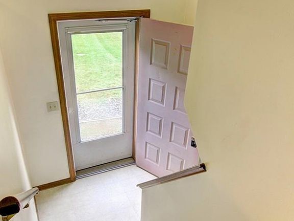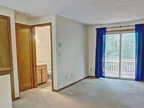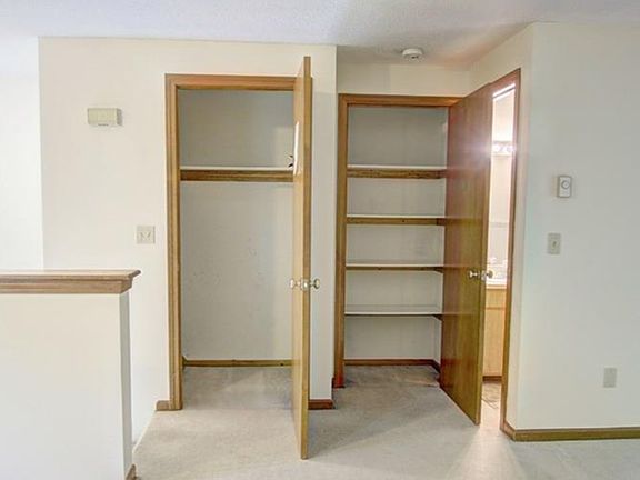 This is a split-level unit. The upper level features the living room, kitchen, bathroom, and a walk-out back porch. The lower level has two full bedrooms, both with closets.