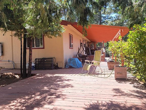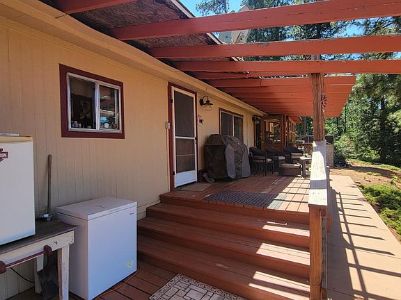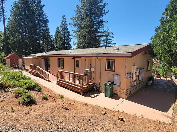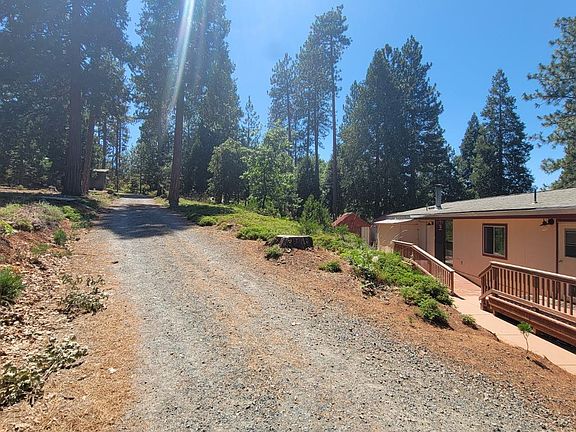 Enjoy your morning coffee with gorgeous views from the deck of this 3-bedroom 2-bath manufactured home. This home features anopen concept kitchen, dining, and living room, separate laundry room, a large master bedroom, and is solar-powered (with PG&Einterconnect) and battery backup. Outside the rear bedroom sliding glass door is a catio (enclosed patio for cats). Masterbathroom has recently installed hc compliant shower with flush access. Detached 3-car garage with shop area. Level Pad with largecrushed rock for RV parking. Will fit two large RVs. 30-amp hookup near home for RV, plus hookup to power home by generator.Horseshoe driveway connects the driveway to the road at two locations. Large chicken coop, two large metal storage sheds, andcovered firewood shed at rear of property. Recently replaced well pump, ozone purifier, and insulation installed in pump house.Recently replaced redwood deck with ramp. Dirt road from rear of house to PG&E water ditch (Columbia Ditch) at bottom ofproperty. Perfect access to hiking.