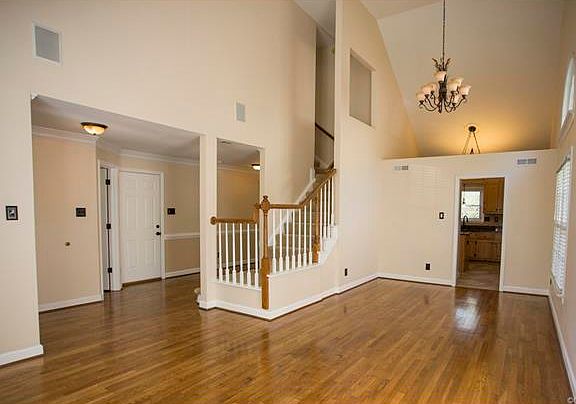 Open & Inviting! This beautiful transitional is located in the wonderfully established neighborhood of Woodlake and offers more than what meets the eye! Delightfully Open 2 story Foyer, Formal Living, Dining, and Kitchen with vaulted ceilings. Cooks Delight with Granite Counter Tops, Granite Under mount sink, Built in Microwave, Smooth Top Range, and Large Pantry. Kitchen Opens to the step down Family room with skylights, ceiling fan, and wood burning fireplace. Gorgeous hardwood floors flow throughout the formal rooms, ceramic tile in the kitchen, and comfy carpet in the family room. Crown molding and chair railing are just a few of the extra details. Garage with finished room with rear entrance...great for an office! The Master Suite features a Vaulted Ceiling, Ceiling Fan, and Fantastic Tiled Master Bath with Jacuzzi Tub, Shower, and updated fixtures. Huge Walk-in Closet too! Second and 3rd Spacious Bedrooms with Ceiling Fans and Full Bath with glass shower doors and vanity with vessel sink. This house offers tons of natural light and a HUGE Rear Deck for entertaining. Big yard and just walking distance to the pool! Trails, play grounds, pools, and great schools!