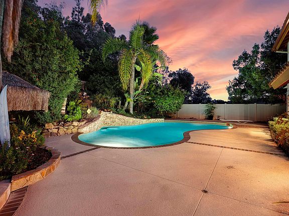 Live the exquisite lifestyle you deserve in this beautiful home in the sought-after neighborhood of Rancho Arbolitos! Nestled upon a premium .38 acre lot with a private backyard oasis featuring a swimming pool, multiple patio areas for relaxing, entertaining or dining al fresco. Meander the magical hidden garden paths on the hill to an upper lounging area where spectacular sunset and mountain views await. New interior paint, carpeting, primary bath vinyl and kitchen dining fixtures have just been added. Enter to gaze upon vaulted ceilings over the formal living and dining rooms with shuttered windows allowing soft, warm sunlight to create an inviting ambiance. One bedroom and full bathroom on the main level makes guests feel welcome. Practice your barista skills at the bar or gather in front of one of the two fireplaces on the main level. The kitchen is spacious enough to cook and enjoy those special moments, with hardwood floors, recessed lighting, granite countertops, bar seating and window overlooking the backyard. The grand primary bedroom has a large walk-in closet, fireplace and an en-suite bathroom. Just down the hall you will encounter three additional generously sized bedrooms, one of these rooms could be an optional living space and has a large walk-in closet. A full bathroom with marble countertops is also on this floor for the secondary bedrooms to share.