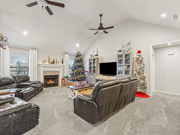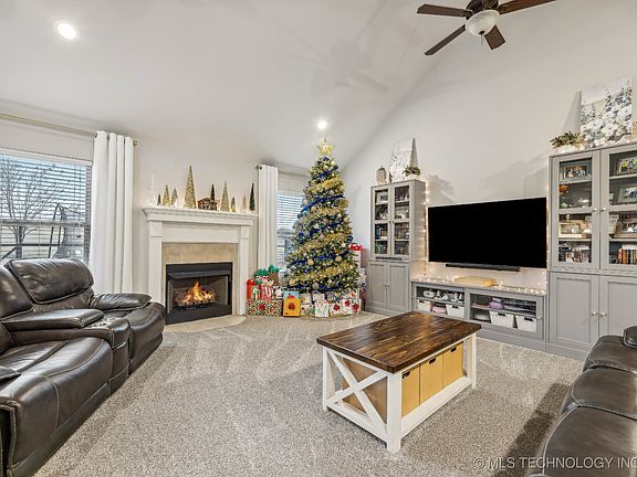 into the living room, where vaulted ceilings and a cozy gas log fireplace create an inviting