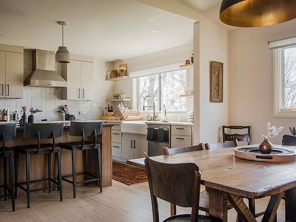 Abundant natural lightExpansive deckFenced-in yardStunning meadow viewsFire pitModern ranchReclaimed barn-wood dining table