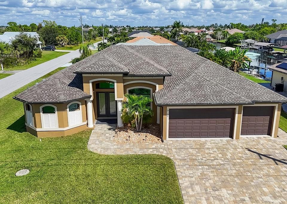 Welcome to your meticulously maintained Florida retreat in the desirable waterfront community of South Gulf Cove! This beautifully upgraded 3-bedroom, 2-bath, 3-car garage home showcases exceptional craftsmanship and attention to detail inside and out. A cobblestone driveway leads to a spacious garage complete with a Tesla charging station and abundant storage. Inside, you’ll find elegant crown molding, custom window treatments, upgraded lighting, and extra outlets above the kitchen cabinets for accent illumination. The open-concept kitchen and living area flow seamlessly for entertaining and comfort. This home is fully equipped with modern conveniences — security cameras, alarm system, two 200-amp electrical panels with surge protection, a 50-amp generator plug (12k generator and cord included), an on-demand tankless water heater, and transferable flood insurance for added peace of mind. Step outdoors to your private oasis featuring a heated saltwater pool and spa with a tranquil waterfall, a cobblestone pool deck, and a fully equipped outdoor kitchen—ideal for year-round Florida living. Enjoy mounted TVs throughout the home, including a waterproof TV by the pool for the ultimate entertaining setup. Positioned with a peaceful canal view (no water access), this property provides serene vistas without the upkeep of direct frontage. Truly move-in ready, this home blends technology, luxury, and lifestyle—just minutes from beaches, marinas, golf, and shopping.