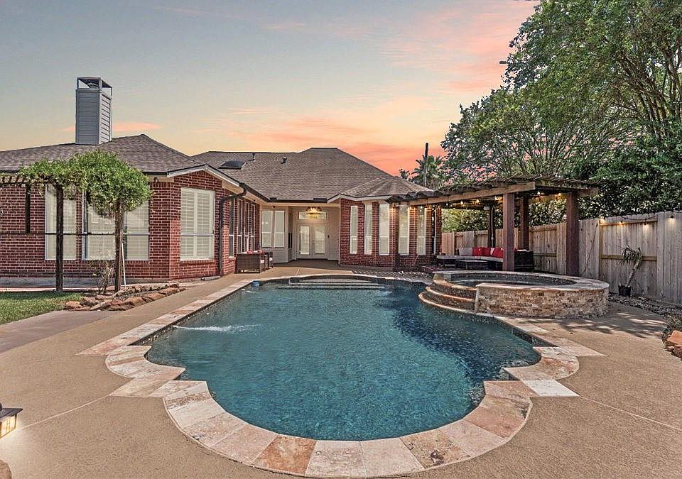 Impressive Single-Story Home with Pool & Spa in Fall Creek! This stunning 1-story home is an entertainer’s dream, offering an open and spacious layout with 4–5 bedrooms, 4 full baths, a dedicated study (could be 5th bedroom), and formal living and dining rooms. Elegant finishes include tile and wood flooring, quartz and granite countertops, shutters, high ceilings, crown molding, art niches and neutral paint throughout. The expansive kitchen features ample counters & large island, breakfast room and open flow into the generous family room, complete with large windows overlooking the backyard oasis. The split floorplan offers privacy with a primary suite & remodeled spa-like bath tucked away on one side of the home and 2 additional bedrooms & built-in desk on the other. A private guest suite is located just off the family room. The oversized garage includes extra space for a workshop, home gym or storage. Located near the Golf Club of Houston with easy access to top-tier amenities.
