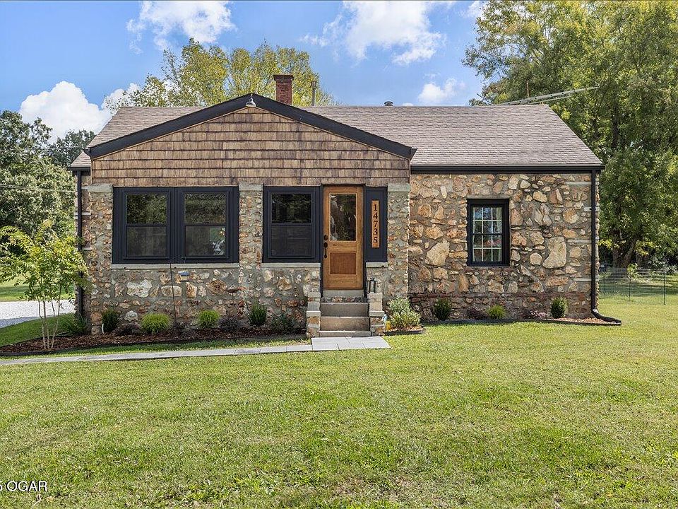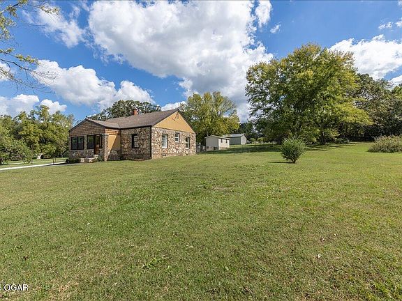 Built in 1954 and rebuilt in 2024. 2 bed 1 bath 1180 sq ft home, blending antique charm with modern updates. Nestled on nearly 4 acres this home features a unique exterior with crystal rocks that glimmer in the sunlight. Inside you'll discover harmonious blend of old and new with smooth finished walls, a cozy sunroom and an electric fireplace. All the work was done by the owner with intention of staying in Neosho. Antique brass hardware, a pot filler, ice machine, quartz counters, Italian tile backsplash. New 200-amp electricity was added to the 25x30 detached shop, and main house. New Septic, HVAC, and windows. Nothing left untouched. Notice the 10x20 unfinished building with a basement that can be used as a storm shelter (be careful, it needs work).