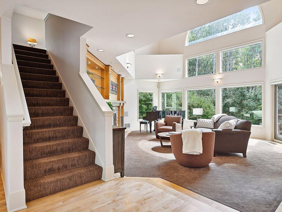 The main floor boasts an open concept, soaring ceilings, & breathtaking views. Kitchen features a Wolf range, SS appliances & granite counters & formal dining.