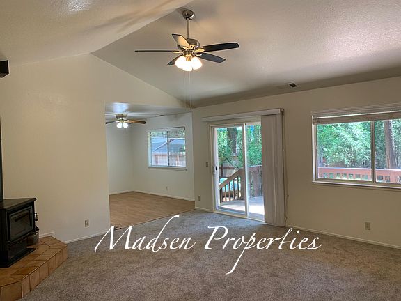 Home features include an electric stove, dishwasher, wood-burning stove, laundry hook-ups, and a large deck.