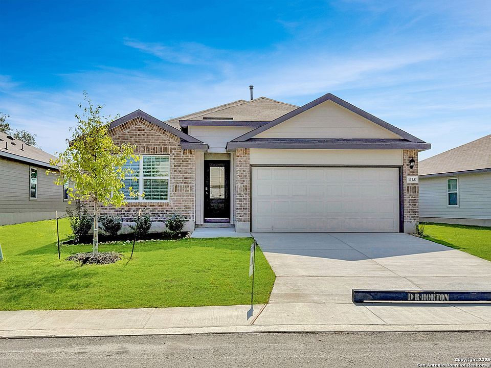 Step into The Brown floor plan at Riverstone at Westpointe in San Antonio, TX, a single-story home featuring 3 bedrooms and 2 bathrooms. The Brown also offers 3 classic front exteriors, a 2-car garage and 1651 square feet of comfortable living. The Brown features classic design and modern features that blend seamlessly to create the perfect everyday space. A welcoming foyer leads to a formal dining room with large windows and a connecting doorway to the galley kitchen. The kitchen includes plenty of cabinet storage, quartz counter tops, subway tile backsplash, stainless steel appliances, and a gas cooking range. A large kitchen island with a deep, single basin sink overlooks the spacious living room. The large first bedroom suite is located off the family room and features a double vanity sink, separate tub and walk-in shower and a private water closet. You'll have all the space you need to get ready in the morning with a large walk-in closet. Spacious secondary bedrooms with large closets and quality carpet flooring, a second full bathroom with plenty of natural light, and a utility room are conveniently located off the living room. Head out the back door and relax on your rear covered patio (per plan) and enjoy full yard landscaping and irrigation. Additional features of The Brown include tall 9-foot ceilings, 2-inch faux wood blinds throughout the home, luxury vinyl plank flooring in the entry, family room, kitchen, and dining area, ceramic tile in the bathrooms and utility room, and pre-plumb for water softener loop. You'll enjoy added security in your new home with our Home is Connected features. Using one central hub that talks to all the devices in your home, you can control the lights, thermostat and locks, all from your cellular device.