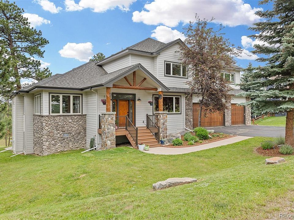 Discover the Evergreen Experience, Centrally located in North Evergreen, this 5-bed, 3.5-bath home offers the ideal blend of mountain serenity and daily convenience. Step into a welcoming foyer that opens to a bright, open-concept layout designed for both relaxation and entertaining. A dramatic stacked-stone gas fireplace anchors the great room, which offers access to the elevated deck perfect for enjoying Evergreen’s scenic beauty year-round. The gourmet kitchen is a chef’s dream w/ abundant cabinetry, granite countertops, large center island, and a tall breakfast bar. Adjacent is a casual dining area w/ oversized windows. The formal dining room provides space for memorable gatherings. A private office w/ French doors and storage closet offers the ideal work-from-home space. Also on the main level: a stylish powder room, laundry w/ utility sink, and cabinetry, and a mudroom w/ a large closet for gear and outerwear. Upstairs, the luxurious primary suite features a gas fireplace and large windows. The spa-like 5-piece ensuite includes freestanding tub, glass-block shower, dual vanities, and boutique-style walk-in closet. Two generously sized upper-level bedrooms share a Jack-and-Jill bathroom w/ separate vanities and private tub/toilet area. The finished walkout basement adds more living space w/ a family room, gas fireplace, and custom wet bar with cabinetry and wine fridge, ideal for movie nights and entertaining. Two additional basement bedrooms have tall ceilings and large windows. A full bath w/ dual sinks and separate tub room, plus ample storage completes this level. A flat, usable backyard, rare for mountain homes, offers space for outdoor fun, pets, or gardening. Enjoy direct access to Elk Meadow Open Space for hiking/biking, Bergen Park for dining and shopping, and the rec center for fitness and community events like concerts and movie nights. Easy access to I-70 makes commuting to Denver or heading to the mountains for skiing and weekend getaways a breeze.