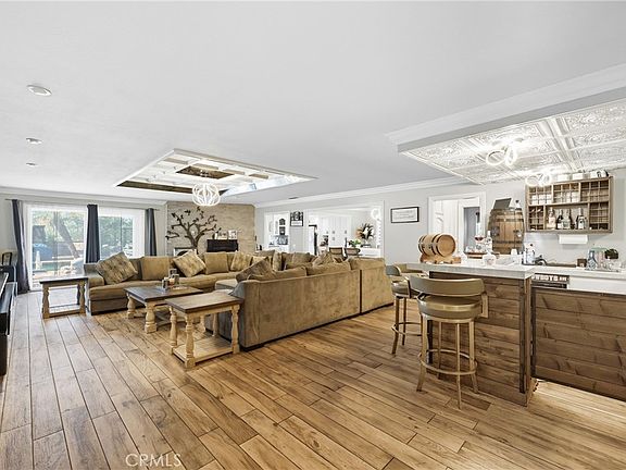 Welcome to your private oasis in the highly sought-after Country Club Estates of Corona. This beautifully upgraded 4-bedroom, 3-bath custom home is situated on a large lot with no rear neighbors, offering the ultimate in privacy and tranquility. The thoughtfully updated interior showcases elegant finishes including marble countertops, glass mosaic backsplash, and ample cabinetry in the spacious gourmet kitchen. The expansive living room features a built-in bar and marble fireplace, while multiple sliding glass doors frame picturesque backyard views. Designed with entertaining in mind, the outdoor space includes a sparkling pool, spa, firepit, built-in BBQ, and expansive deck—perfect for gatherings. An elevated sport court provides panoramic views and the lower garden level offers peaceful nature walk access, waterfall feature, and space for gardening. Additional highlights include a wide side yard with space for a boat or trailer, fruit trees, and regular visits from local wildlife. This is a rare opportunity to own a turnkey retreat that feels like a private resort.