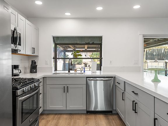 Turnkey home featuring bright, open floor plan and brand new flooring throughout. A stunning modern kitchen with new appliances, cabinets, and countertops, plus beautifully remodeled bathrooms. Spacious backyard oasis complete with a covered patio, sparkling swimming pool, and relaxing jacuzzi spa.