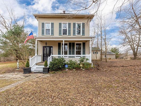 Beautiful 2-story, 4 bed, 2 bath farmhouse on over 8 and 1/2 acres with fenced pasture, detached garage, and a huge 2-story bank barn. Character abounds in this home with high ceilings and lots of tall windows. Beautiful woodwork and original wide plank hardwood floors throughout. Main level floors have been refinished. Floor to ceiling built-ins in the living room. Remodeled kitchen with newer cabinets, granite countertops, stainless appliances, and a butcher block island. Front and back staircases and a full bath on each level. 1st floor laundry. Newer roof and windows. Half of the property is wooded with a creek running through the middle of the property. Unique property with so much to offer!