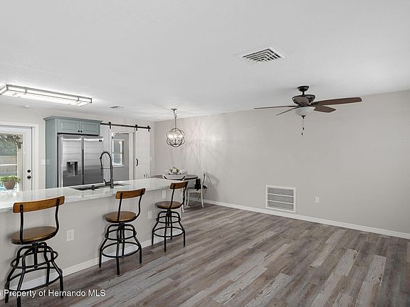Active Under Contract - Accepting Back Up Offers - Welcome to this dream POOL home with 3 bedrooms and 2 modern bathrooms, a split floor plan remodeled and designed for comfort and privacy. This lovely home is situated in the middle of Spring Hill in a neighborhood where homes have curb appeal yet no HOA. Step into the inviting living space adorned with upgrades and touches of color throughout creating a warm and welcoming atmosphere. You'll find smart light/fan features throughout, a programmable thermostat, and 3 security cameras already in use and ready for you to customize as you wish. The heart of the home is the beautifully upgraded kitchen, featuring sleek stone countertops, modern cabinets with a built-in bar, modern fixtures, stainless appliances, and a glass door with built in privacy blind that leads to a charming lanai overlooking the pool and backyard oasis, perfect for enjoying morning coffee, just relaxing or hosting gatherings, with a mounted tv, fan, motion light, hanging lights string and decorations. The master suite also has direct access to the lanai/pool area with glass french doors. The privacy fenced backyard includes a shed for additional storage solutions, and a larger shed that is optional to purchase. Other features to note include the oversized garage with an auto door opener, septic field new 2023, AC new 2022, and the roof was replaced in 2016. Schedule your private tour today to view this stylish home! Note: Some of the pictures have been virtually staged. Please verify information including measurements and school zones, and be aware that there is audio/video security on the premises.