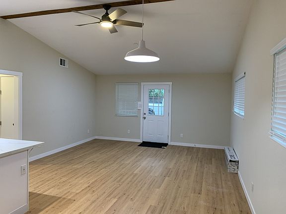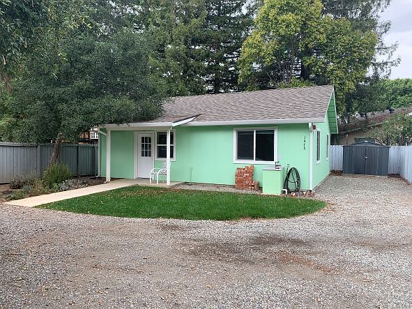 This sunny, two bedroom, one bath house is down a long private driveway, secluded from the public street. It has a spacious open floor plan, with vaulted ceilings, that is filled with light. It features hand textured plaster throughout, plank floors, dual pane windows and two-inch cordless blinds. There is central (gas) heat and air conditioning.