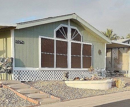 UPDATED: Most lighting and 4 ceiling fans, TRANE Furnace & Air Conditioning, fresh paint, Reverse Osmosis, Dishwasher, Refrigerator, Washer & Dryer, plumbing fixtures and chair height toilets. This low maintenance manufactured home made by Fleetwood in 1990 is 24 x 54 (1536 square ft) has solar screens, vaulted ceilings open concept –a 2 Bed 2 Bath home (Main bath has tub-both baths have walk in showers) that comes furnished. Enjoy the long-covered carport parking & large shed with electric. Best of all- NO STAIRS!