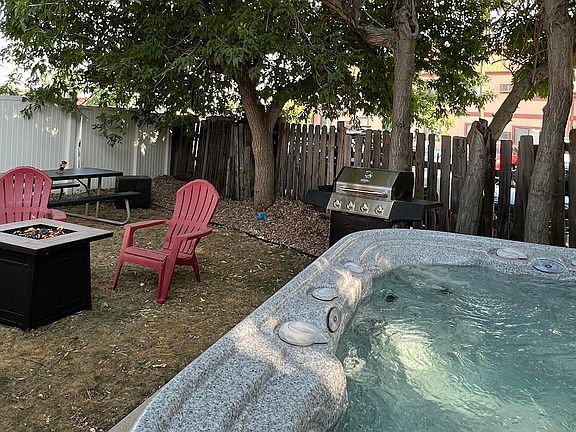 Privacy fenceBunk roomHot tubPrivate enclosed backyardGas grillHangers and laundry basketsLarge table