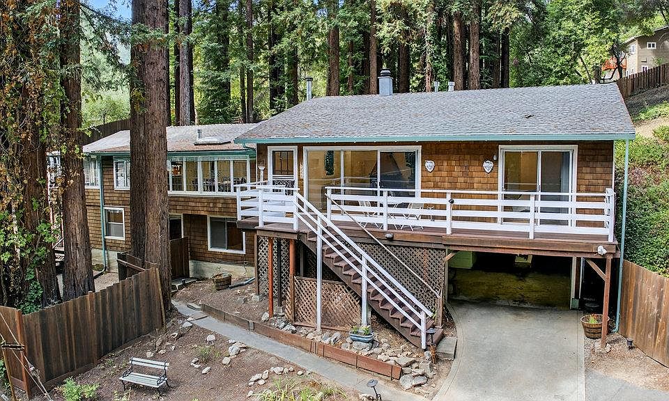 Live the life of your dreams at this Mountain Retreat! This inviting home sits on a peaceful, park-like 0.65-acre parcel surrounded by majestic redwoods. The main level offers 5 comfortable bedrooms and 2 bathrooms, while the lower level features a private 1-bedroom, 1-bath guest suite with its own entrance, perfect for loved ones or extended stays. Inside, the charming kitchen opens to the living and dining areas, anchored by a cozy wood-burning stove. Three skylights and an abundance of windows enable light-filled spaces and bring nature views. Artistic touches include stained glass, knotty pine and a stone accent wall. A bright sunroom flows onto the sun-filled back deck,perfect for gatherings, while a welcoming living room with fireplace and sliding doors opens to the sunny front deck. Outdoors, enjoy a fully fenced yard and your very own redwood grove, offering both sunny and shaded retreats.Plenty of room to garden, set up a play structure or meander through the woods.Parking for 4 cars, plus 2 ample sized storage/utlity rooms allow space for a workshop or other projects. Just minutes to downtown Boulder Creek for shopping and dining, with an easy commute to Silicon Valley. This home brings the best of both worlds by blending mountain serenity with everyday convenience.