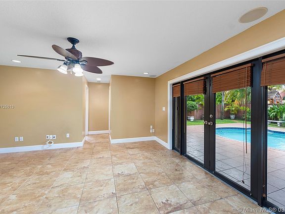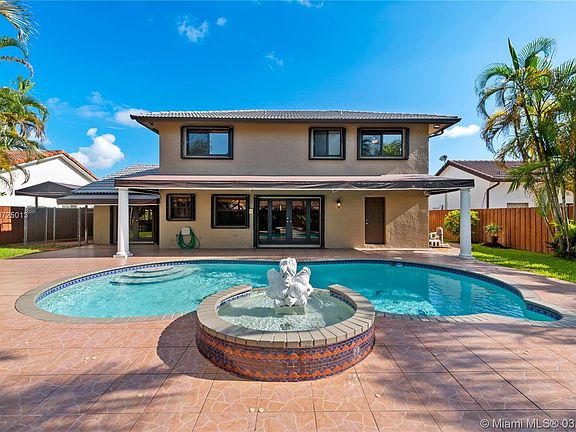 This immaculately maintained home offers 4 beds / 3 baths and is equipped with a pool that features an overflow spa style center area. Kitchen is fully updated and customized with Elaphodus Tiger granite countertops including matching accent bar. Throughout the entire house there is sleek Bruce hardwood flooring, tiles and laminate wood. Impact double glass windows in addition to sound reduction windows on upper level rooms and Accordion Recon shutters throughout the house. Top of the line Q-See Surveillance video system and Century Alarm system with hardwired sensors and remote arming. Spacious driveway, 2-car garage plus covered and secure private carport. Lush landscaping with high-end quality palms and fountains. Just minutes away from great schools, shopping and parks.