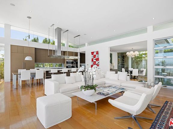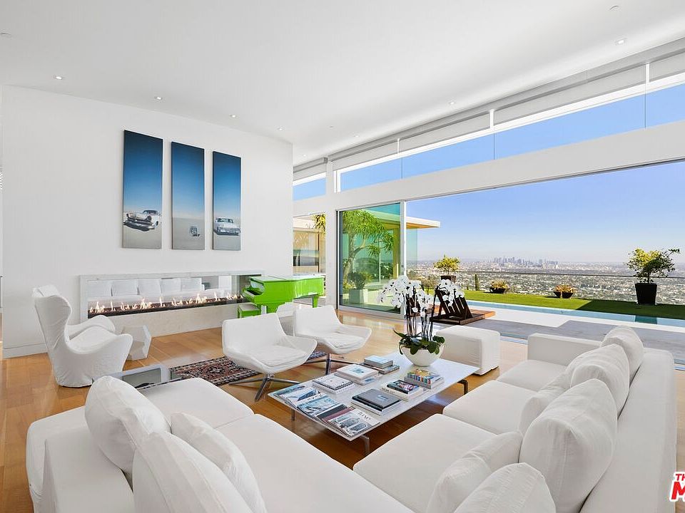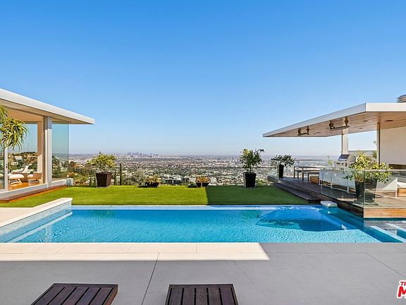 This sleek Paul McClean-designed contemporary home is located on the coveted eastern side of Blue Jay Way, offering one of the most desirable perspectives in prime Hollywood Hills' Bird Streets. The home's open-concept design features soaring ceilings and disappearing Fleetwood doors that create a seamless flow for indoor-outdoor living. The open-concept gourmet kitchen is equipped with top-of-the-line Miele appliances, a large island, and bar top seating. Fall asleep to city lights and wake to the sunrise in the glass-wrapped primary suite, featuring dual bathrooms and closets. Outside, you'll find a newly refinished pool with chaise lounges and an outdoor cabana, complete with a built-in BBQ, fireplace, and heaters. Available fully furnished for month-to-month or long-term leasing. Additional photography is available upon request.