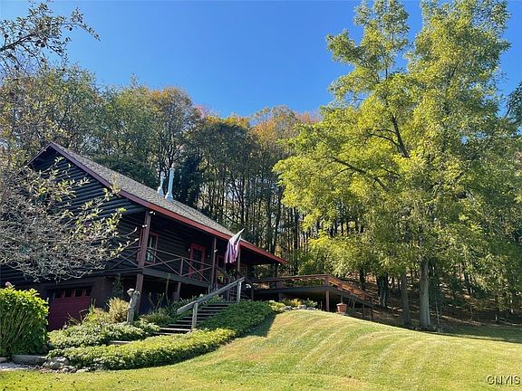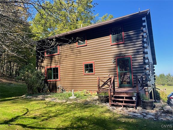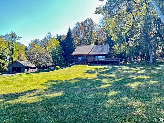 Escape to the peace and privacy of this beautifully crafted Log Home, nestled on 5.507 acres of natural landscape. Offering a perfect blend of rustic charm and modern convenience, this 1,645 square foot home features 3 bedrooms and 2 full bathrooms, with a smart layout that includes a first-floor bedroom and full bath - ideal for guests or single level living. Step inside to find warm hardwood floors, soaring cathedral ceilings, an applianced kitchen with Woodmode cabinets and a cozy living room with fireplace that flows into the dining area, creating an inviting space for everyday living or entertaining. The first floor laundry adds convenience, while the log construction gives the home timeless appeal. The two bedrooms up are HUGE and offer walk-in closets. Car enthusiasts or hobbyists will love the abundance of garage space, including a 1.5 car garage under the home and an additional 2+ car detached garage - plenty of room for vehicles, equipment or a workshop. This unique property offers space, character and the tranquility of country living - all just a short drive from local amenities. The view is incredible and you can see for miles! Offers due Tuesday!